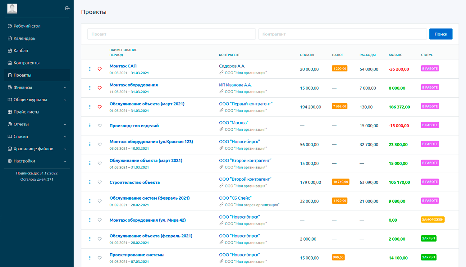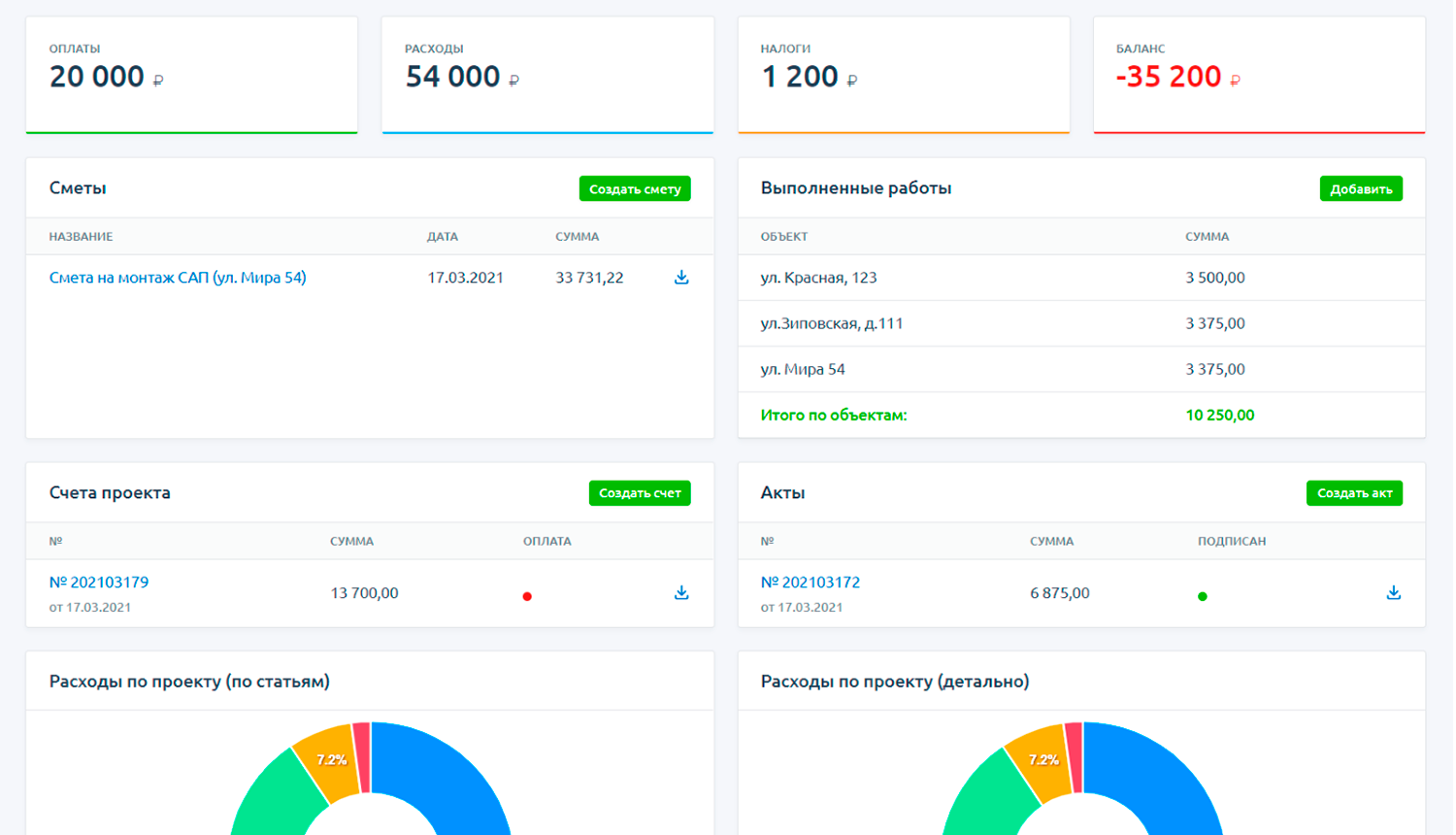 Учитывайте расходы и оплаты в рамках проекта. Создавайте счета и акты, составляйте сметы. Планируйте свою работу на канбан доске и в календаре.
